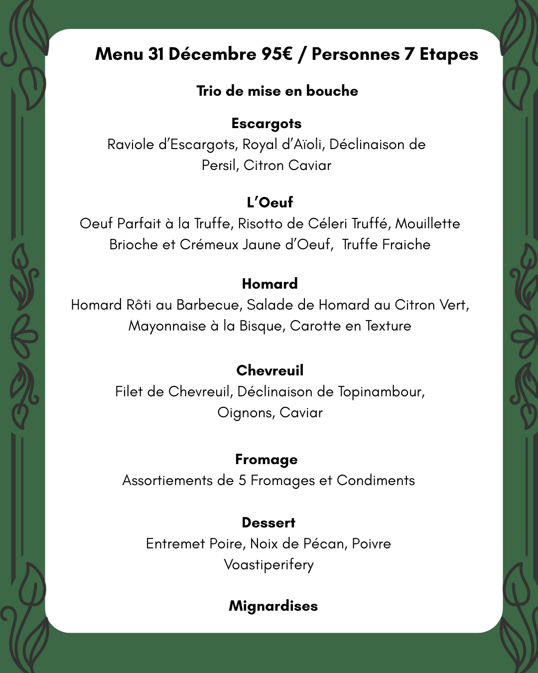 (Mise en bouche+Entrée+Poisson ou Viande + Dessert)